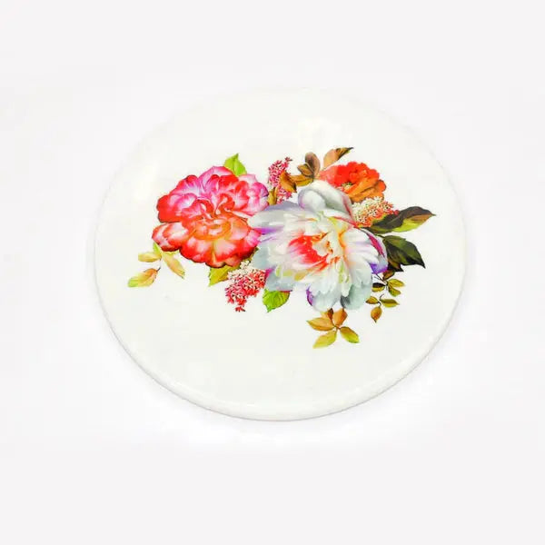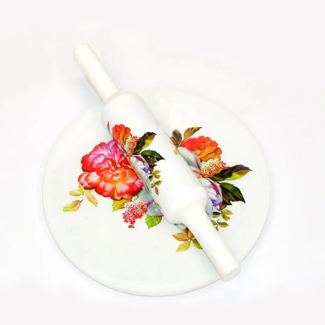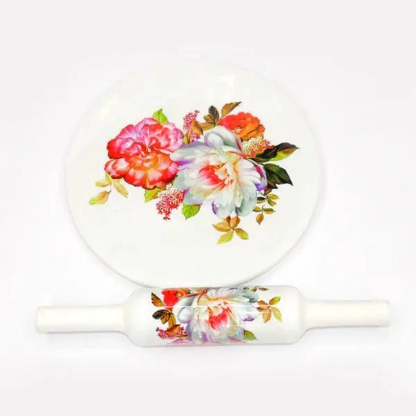 Printed White Marble Roti Maker with Wooden Belan Enamel Print/White Marble Chakla 10 Inch Diameter with Belan (Multflower)